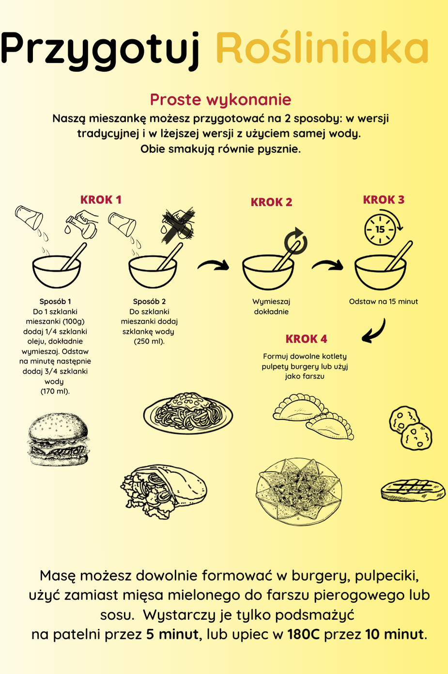Generalnie – z tą masą można przygotować wszystkie potrawy i dania, których podstawą jest mięso mielone. Tylko nasze dania i potrawy będą Vege.
